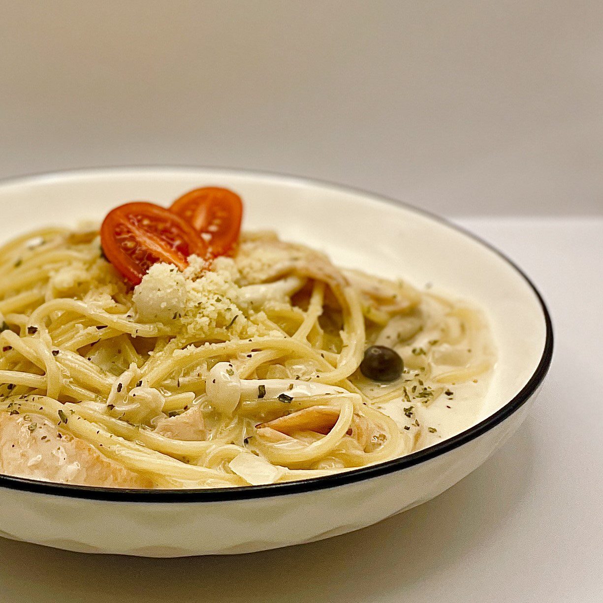 Spaghetti with Creamy White Sauce, Topped with Ham, Black Pepper, Fried Mushroom and Herbs