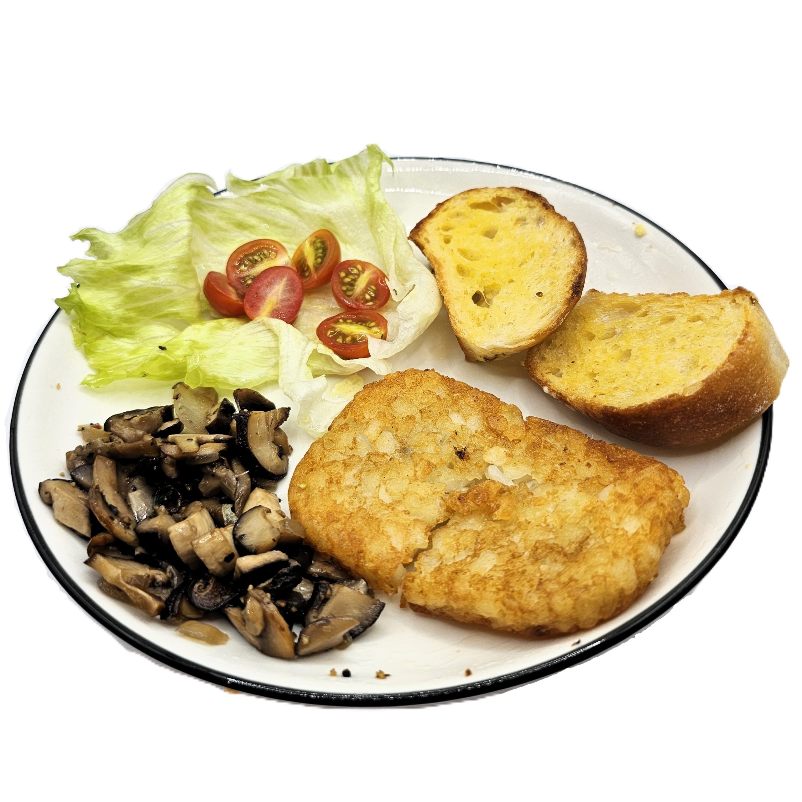 Fluffy Scrambled Eggs, Whole Wheat Baguette, Homemade Tomato Salsa, Hash Brown, Fresh Coral Lettuce, Sautéed Mushrooms