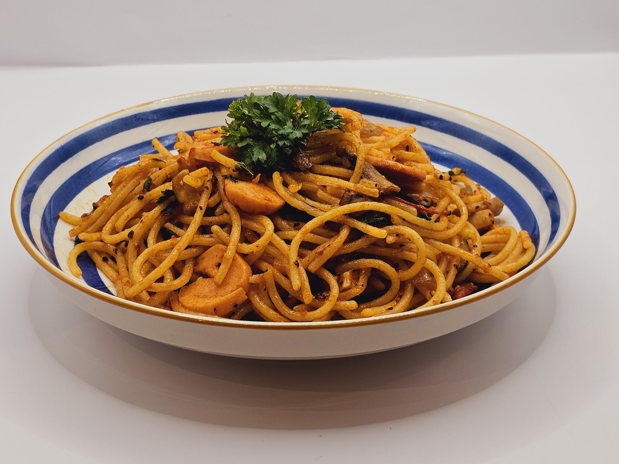 Spaghetti with Tomato Sauce, Topped with Sausage, Black Pepper, Fried Mushroom and Herbs